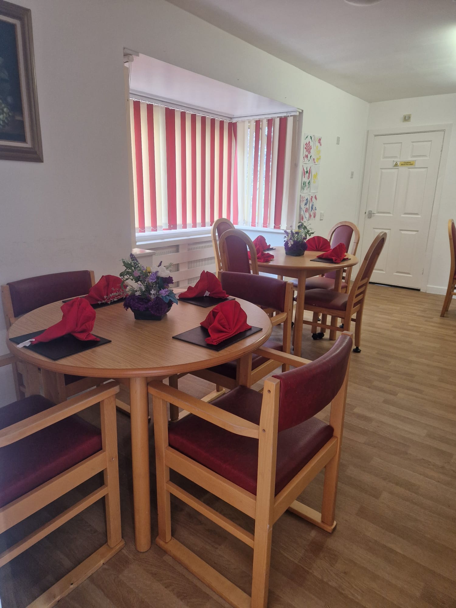 Residents are free to choose the time they would like breakfast and can choose anything from a traditional cooked breakfast, cereals toast with preserves, porridge or fruit. Lunchtime meals are a set menu, however special diets, likes and dislikes are always catered for and an alternative cooked as required. Evening dinner consists of a choice of light meals and a sweet. In addition to these meals, mid morning and mid afternoon tea breaks with biscuits and or cakes are served each day, and residents can order other drinks or snacks at any other time of the day or night.